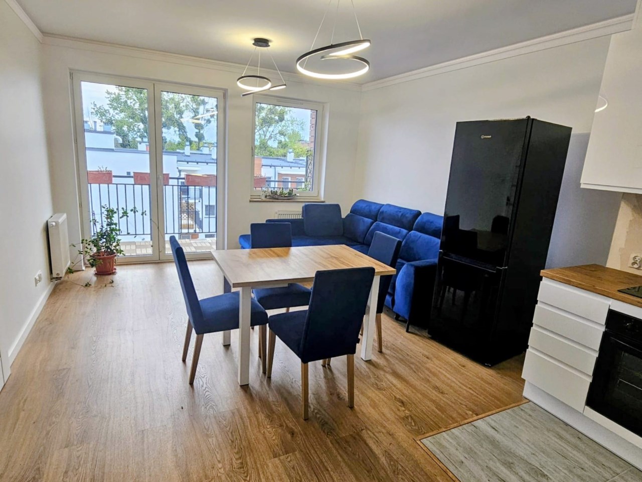 Mieszkanie jest umeblowane. W dużym pokoju jest narożna kanapa z funkcją spania, rozsuwany stół, 4 krzesła. Aneks kuchenny wyposażony jest w meble, kuchenkę indukcyjną, piekarnik, okap, lodówkę z zamrażarką. W sypialni mamy szerokie łóżko i szeroką trzydrzwiową szafę. W sporej łazience oprócz szafek, umywalki i wc jest szeroka kabina prysznicowa oraz pralka.
